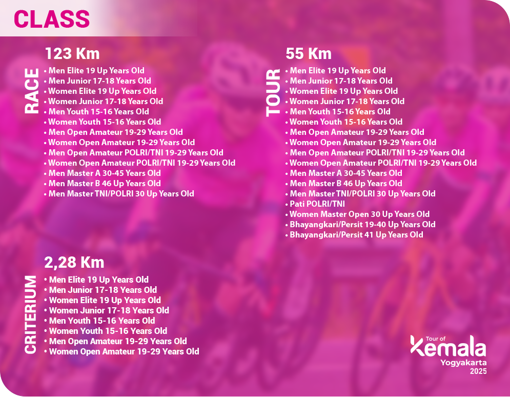 Kategori 123 KM merupakan ajang balap sepeda yang akan diikuti oleh para peserta profesional dari Nasional dan Internasional akan menjelajahi destinasi - destinasi wisata indah di daerah Yogyakarta.